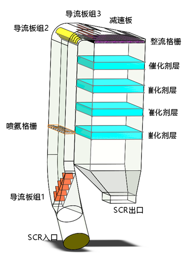 该项目为水泥窑炉中低温SCR脱硝催化剂研发及应用,由中国建筑材料科学研究总院有限公司、上海南方水泥有限公司、清华大学等公司联合,于2018年8月在长兴南方水泥有限公司启动研究。我司于2020年参与到该项目的SCR 流场优化设计环节,通过对烟道和均流装置进行优化设计,达到了如下指标:首层催化剂前速度分布相对标准偏差<8.5%,烟气入射首层催化剂的角度<8°,首层催化剂层上游氨氮浓度分布相对标准偏差<3.7%,优于相关通用标准。同时,优化设计的导流装置对负荷变化引起的烟气量波动具有较好的适应性,该项目取得了良好的效果,助力最终的中低温SCR脱硝催化剂的研发及成功应用。