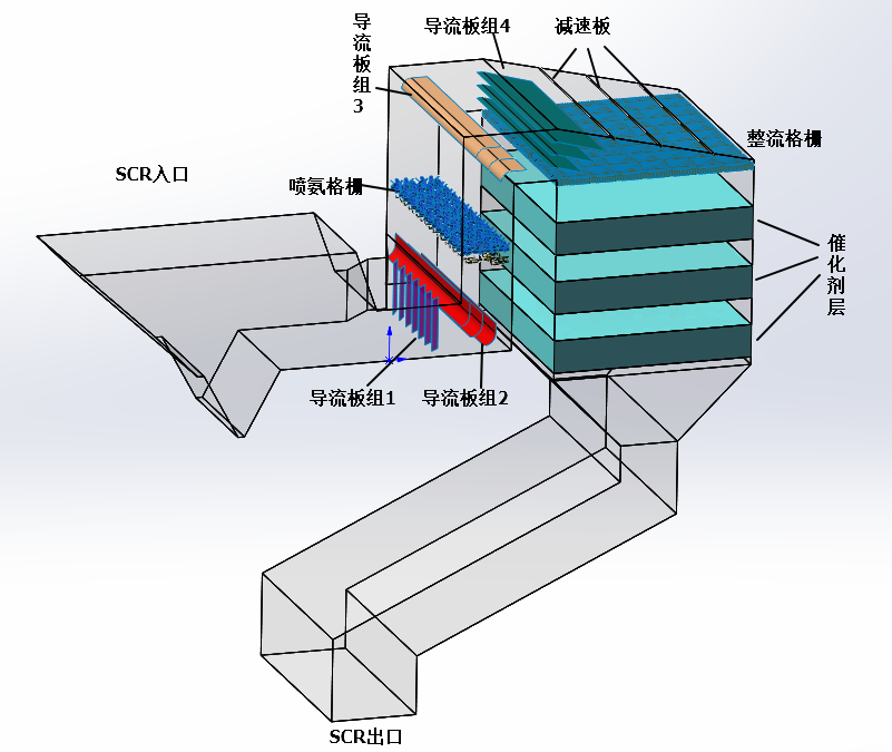 嘉峪关宏晟电热公司3号350MW锅炉为超临界燃煤空冷凝汽式发电机组,单台锅炉设置2台SCR反应器。受业主委托,我公司于2022年3月30日至2020年4月3日对宏晟电热公司3号锅炉的SCR装置进行摸底试验工作。通过对3号350MW锅炉高(325MW)、中(260MW)、低(150MW)负荷下进行脱硝系统(SCR)摸底测试,用网格法对SCR的烟气温度场、速度场、浓度场及氨逃逸等进行测试,为建立脱硝合理分区及优化控制模型提供原始基础数据。同时对SCR内的导流装置进行了优化改造,最终将催化剂前速度场相对分布偏差由改造前的17.87%降低为6.09%,首层催化剂上游NH3浓度场的相对标准偏差由12.08%降低为4.64%,烟气入射首层催化剂的角度由>20°优化至<7°,系统的总压降也由947Pa降低为878Pa,流场优化改善效果显著。