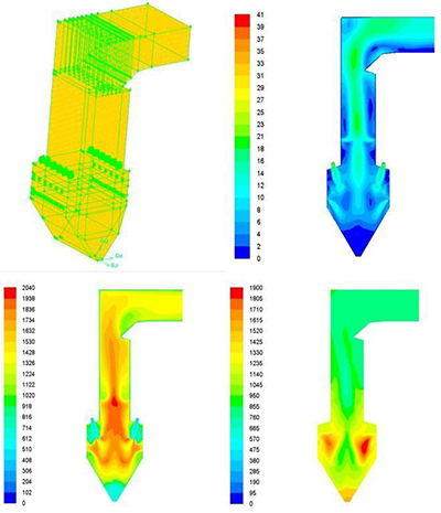 标高34.5米处加一组燃尽风共52只,前后墙48只与分级风喷口对应,离开前后墙两米处分别布置一只SOFA风,侧墙SOFA共4只。下倾角度25度,燃尽风风率18%,不封堵二次风,通过减少原各二次风速来提供SOFA风。